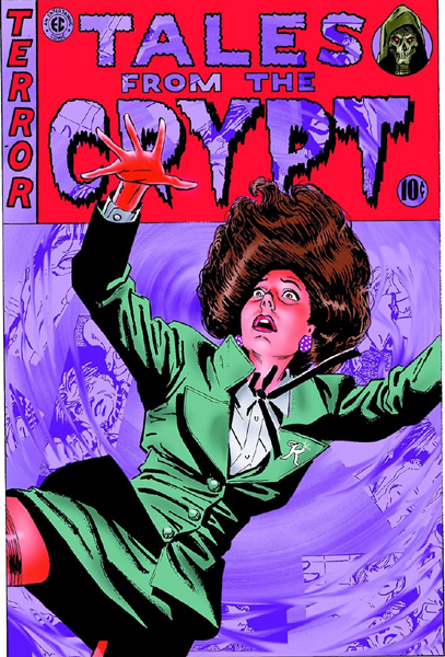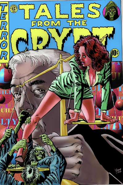 Une couverture allégorique intrigante et efficace montrant l'héroïne tentant de fuir une armée de morts vivants sur une balance géante tenue par un juge.
