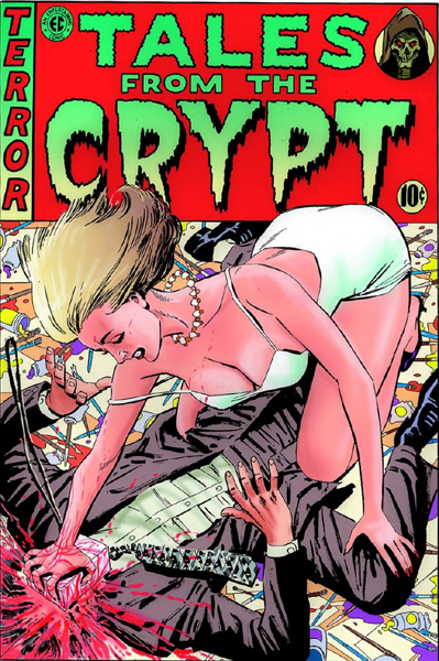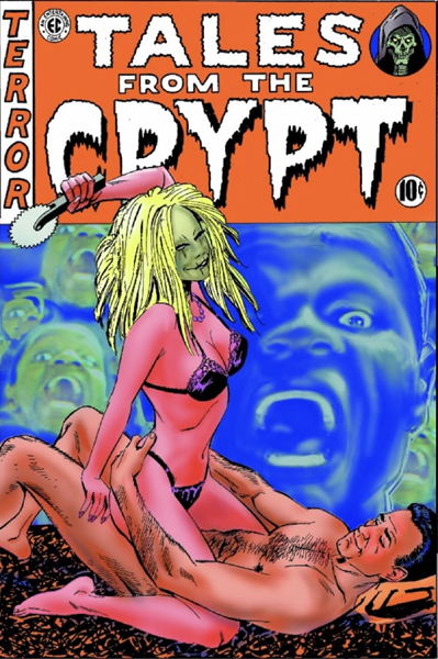 Un homme fait l'amour à une femme en sous-vêtements (!) qui s'apprête à le frapper avec une scie circulaire pendant que des visages hurlent à l'arrière-plan. Juste bizarre.