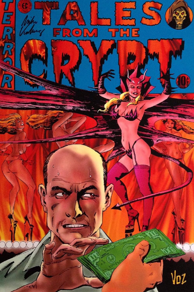 Un homme, dont l'expression trahit la mauvaise conscience, accepte de l'argent tandis que le déguisement diabolique de la stripteaseuse derrière lui crée une allégorie montrant qu'il vend ainsi son âme au Diable. Les flammes renforcent l'atmosphère infernale tout en servant de foreshadowing à la conclusion de l'épisode. Une réussite!