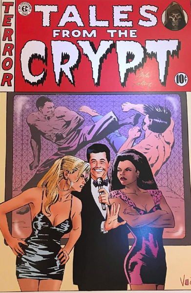 Devant un écran retransmettant un combat de MMA, un animateur jovial se tient entre les épouses des combattants et leur animosité aussi évidente que réciproque. Si cette couverture synthétise bien l'histoire, elle échoue à instaurer une ambiance horrifique ou à donner envie d'en savoir plus.