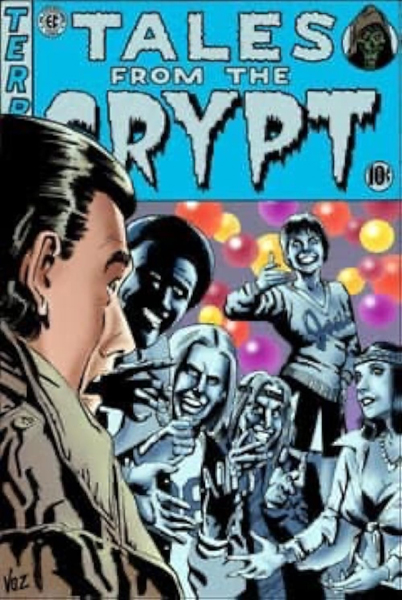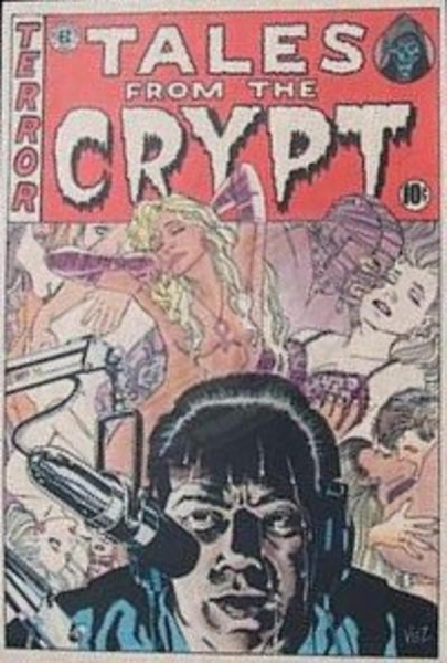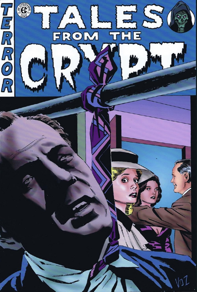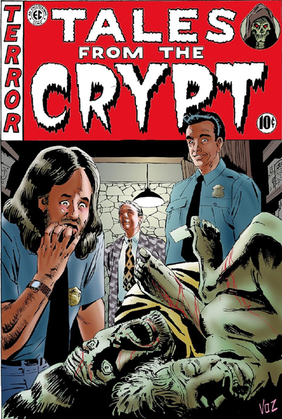 Le trio de protagonistes fait face à des cadavres disposés pêle-mêle et dont l'étiquette au pied de l'un d'eux indique qu'ils proviennent d'une morgue. Les différentes expressions reflètent bien leurs différentes moralités: détachement pour le savant, angoisse pour son premier complice rongé par le remord et sourire sadique pour le second, cruel et amoral.